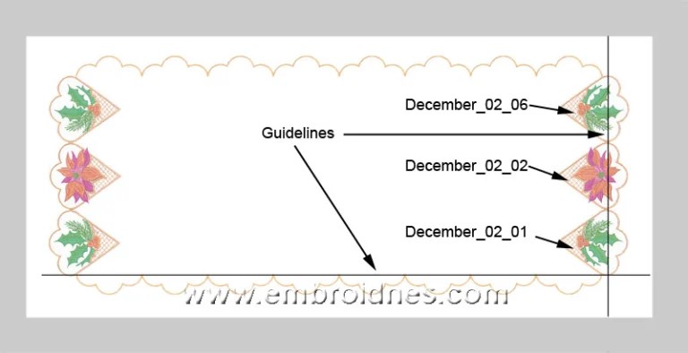 December_02_04. 874 stitches, 75.7 mm x 77 mm. Hoop one layer of water-soluble stabilizer (Vilene). You will need to mark your fabric with guidelines so you can align them with checkpoints, refer to diagram 1. Start embroidery: