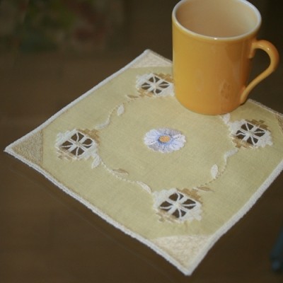 Our Vanessa coaster machine embroidery design is approximately 5.5 inches square. For this project you will need to have 8 inches fabric (we used cotton-linen blend in yellow color). Feel free to experiment with your favorite color.