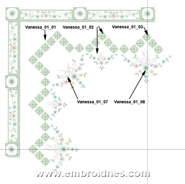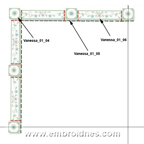 Now embroider all internal designs on your linen. Diagram 2 is showing where to place internal design elements. Print all design templates so that you can correctly mark center of each design on the cloth. Start with Vanessa_01_01 corner element. The first check points on the first corner design are for your following design alignment, so ignore it for now. Ignore thread change #1, #2 and start with #3 (only for your first corner element, you will need the check points for the rest of them). Follow color chart for further detailed instructions. Vanessa_01_07 and 01_08 are the last design elements to embroider. After you are done embroidering all elements on the cloth place stitched together boarder on your square linen fabric refer to diagram 1. Attach it with pins or basting stitch and start sewing boarder to fabric with straight stitch first. Trim excess fabric from the back and use zigzag stitch all around. For your final pass use satin stitch. Once you are finished you can wash off stabilizer, flat dry and press from the back. Vanessa is ready for display!